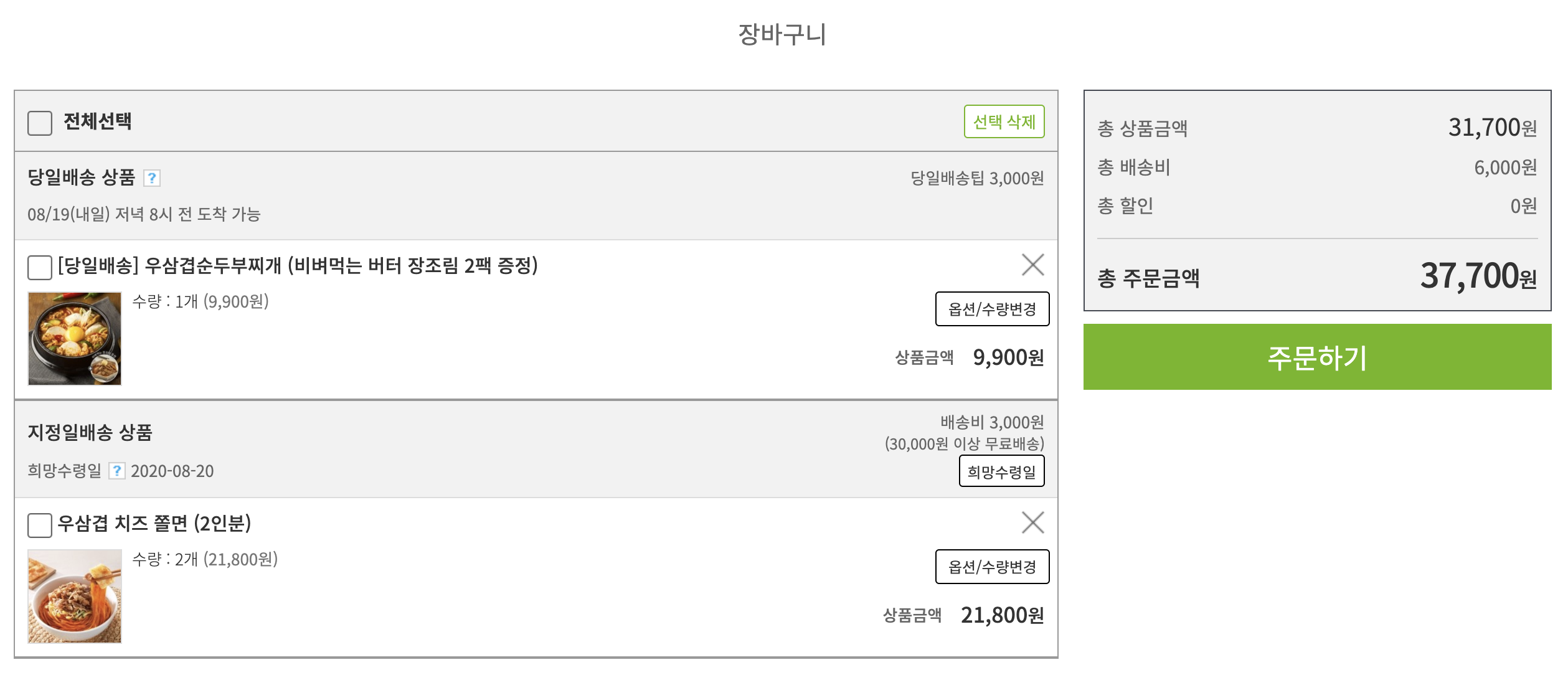 - 배송별로 상품이 구분되는데 잘 눈에 띄지 않음