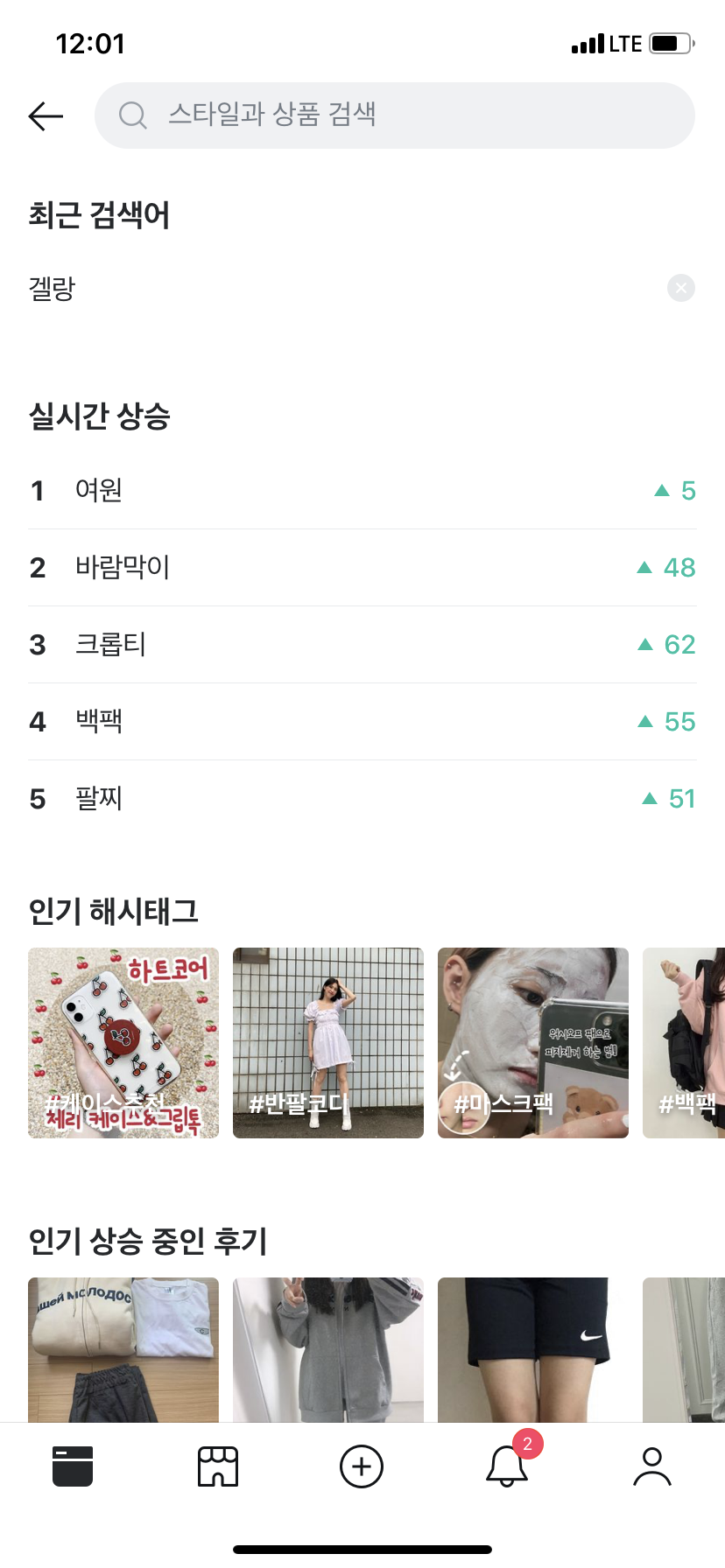 [검색] - 검색어 관련 말고도 하단에 '인기 해시태그', '인기상품', '인기 키워드'와 같이 다양한 정보를 담아 검색어의 힌트를 얻거나 원하는 검색어로 이동을 빠르게 함 - 이미지도 같이 보여주니 검색보다 하단의 콘텐츠로 시선이 가게 됨 |