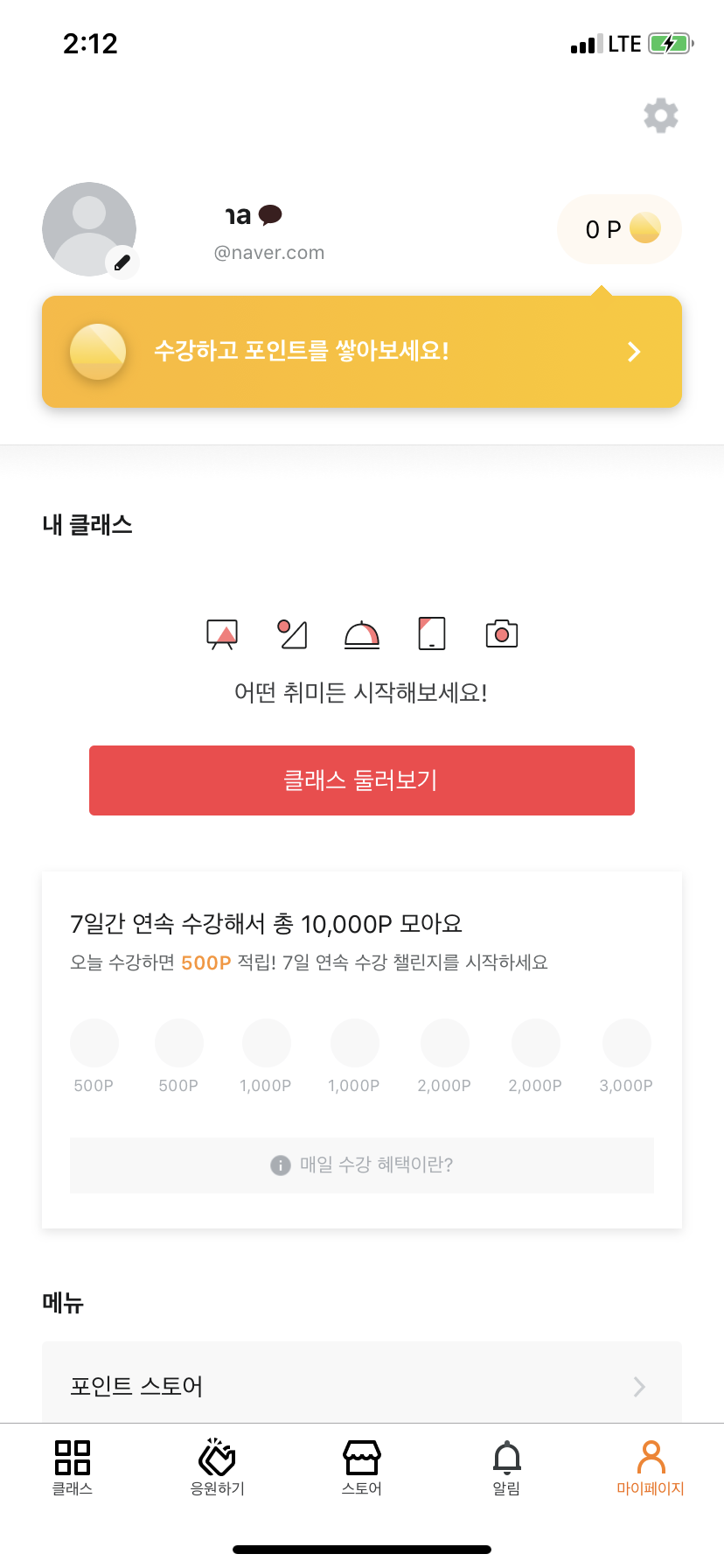 [마이페이지] - 포인트 위주의 구성과 안내 메시지를 넣어 포인트 적립을 강조하고 있음 - 클래스 수강시 7일 연속을 들으면 그에 따른 포인트 혜택 제공 |