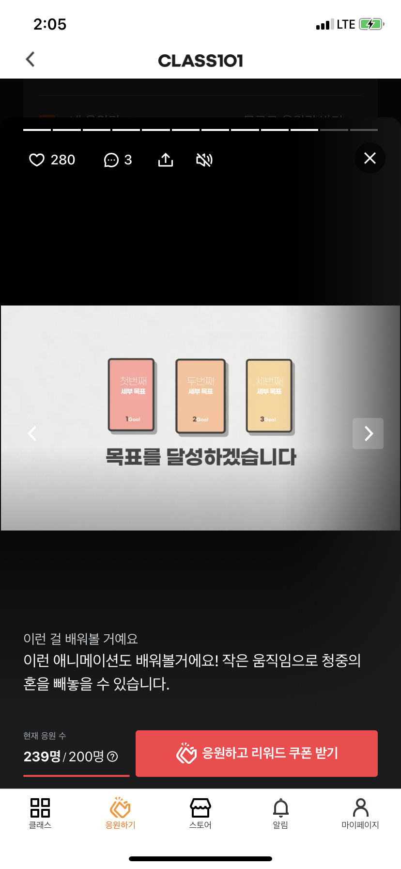 [응원하기 - 상세] - 클래스 상세의 형식이 인스타의 스토리처럼 되어있음 - 이미지와 간략한 설명을 슬라이드 형식으로 보기에 클래스를 빠르게 파악하기 좋음 - 배경이 흰색일 땐(정확하진 않지만) 화살표가 잘 보이도록 그라데이션된 배경이 보임 - 해당 클래스의 내용이 다 끝나면 바로 다른 클래스로 이동하기에 둘러보는 시간이 오래 유지될 것 같음 |