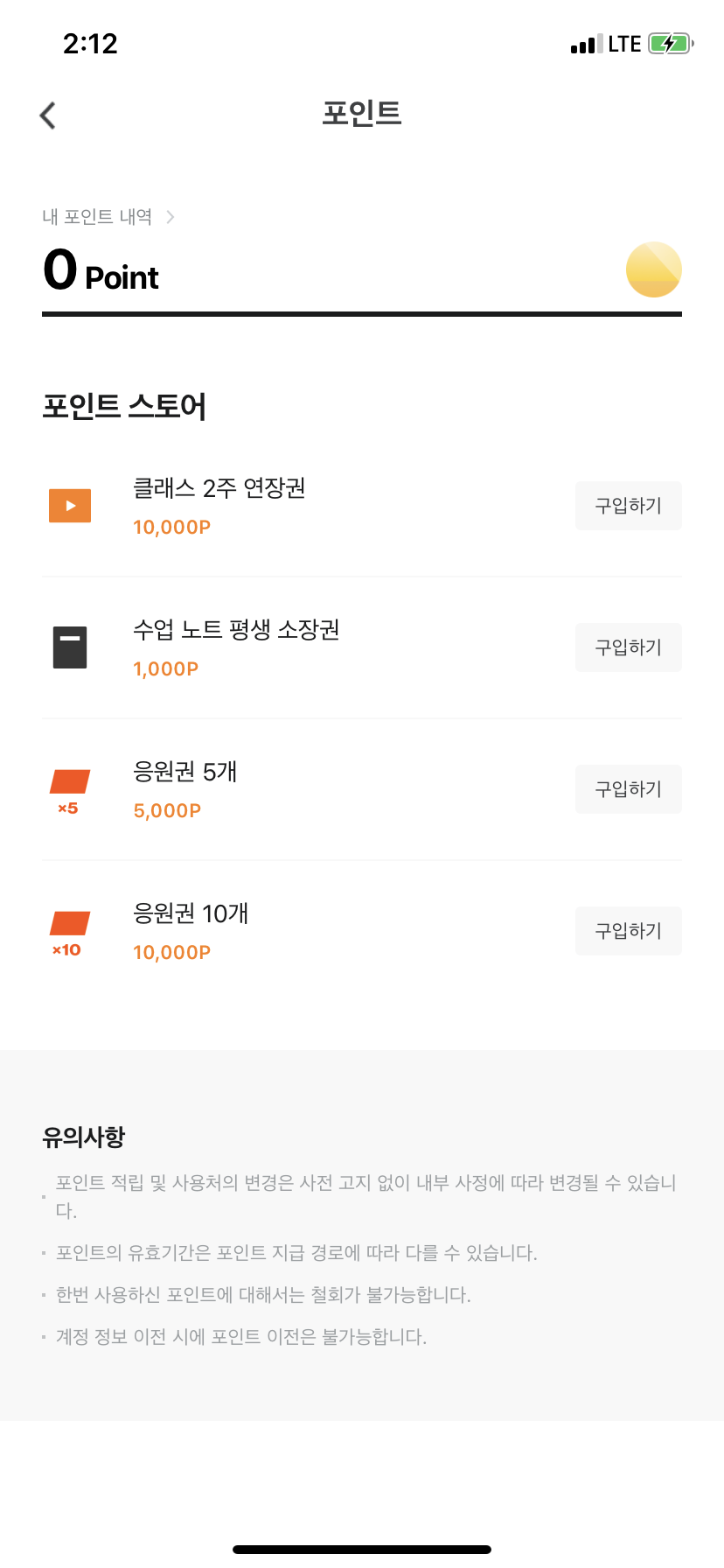 [마이페이지 - 포인트 스토어] - 적립된 포인트로 이용 아이템을 구매할 수 있음 - 학습기간 연장, 온라인 텍스트로 제공된 내용을 다운로드 받을 수 있는 수업노트, 응원권 - 포인트를 따로 구매할 수는 없음 |