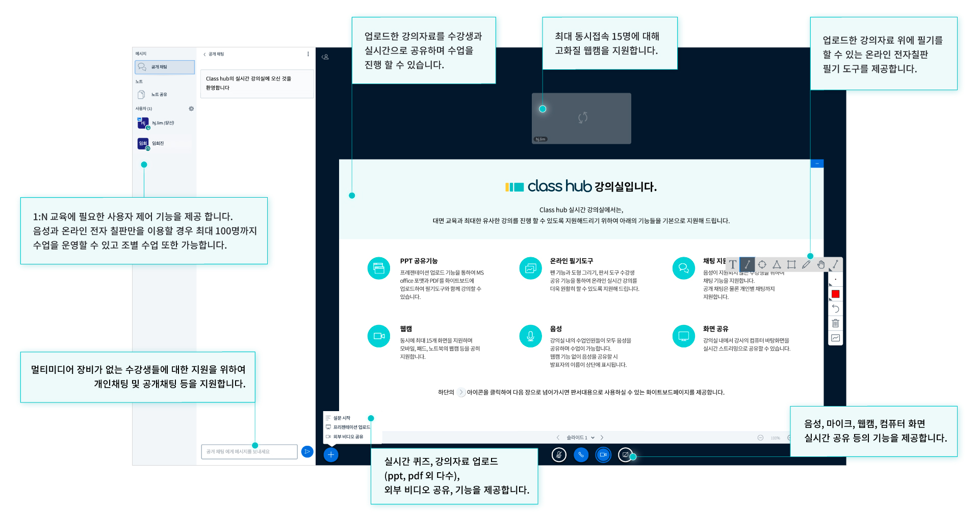[클래스허브] - 멤버십에 따라 10명부터 무제한까지 초대 가능 - 화상을 기반이지만 기기가 준비되지 않은 학생은 채팅, 듣기만 가능 - 특정 학생 음소거를 하거나, 발표자 지정해 음성인식 기능 제공 - 실시간 퀴즈를 진행할 수 있음 - 카카오톡으로 스케줄 알림 - 수강료 결제 기능 - 강의는 녹화되어 학습자가 복습 가능 - 공지를 등록하거나 과제 제출을 받을 수 있음 |
