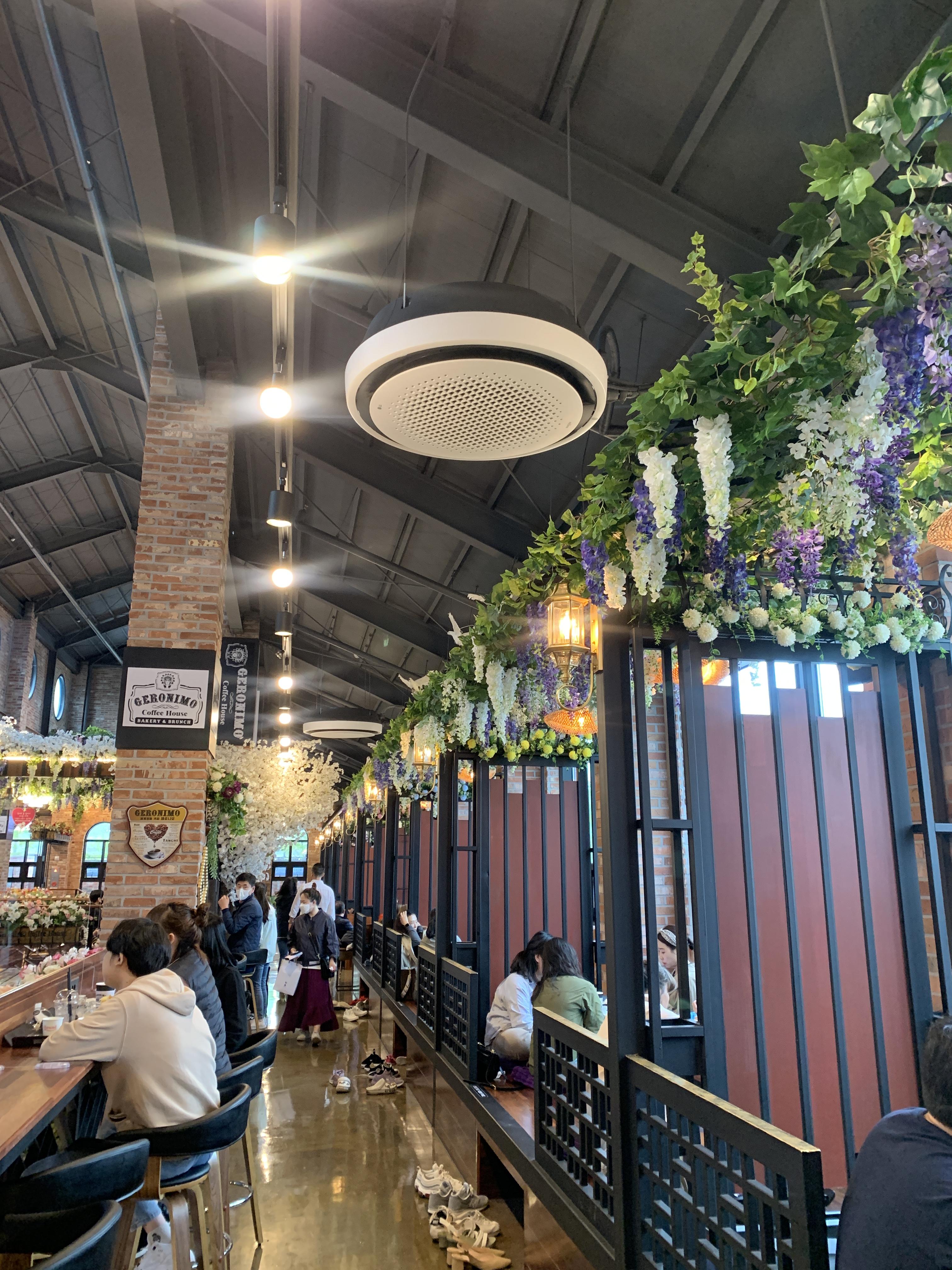 내부 정원같은 꽃 장식과 한국스러운 좌식 테이블에 흥미로움